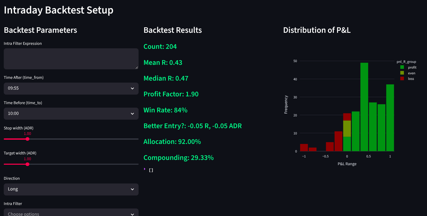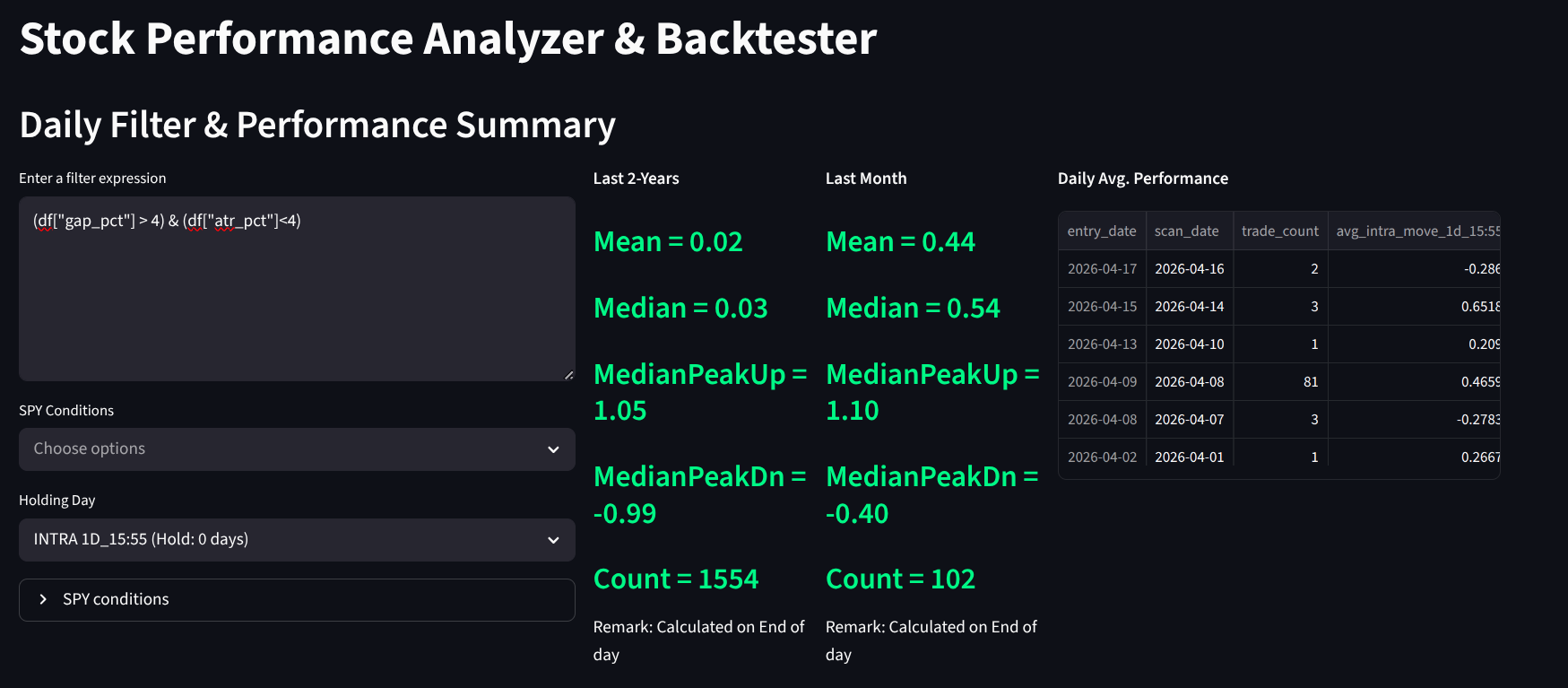 ส่วนแรกของเครื่องมือคือ Daily Scan ผู้ใช้สามารถใส่ Expression เพื่อกรองหุ้นตามต้องการ เช่น การหาหุ้นที่ Gap Up มากกว่า 4% พร้อมเงื่อนไขตลาดประกอบ เช่น ทิศทางของ SPY หรือเจาะจงเฉพาะวันในสัปดาห์