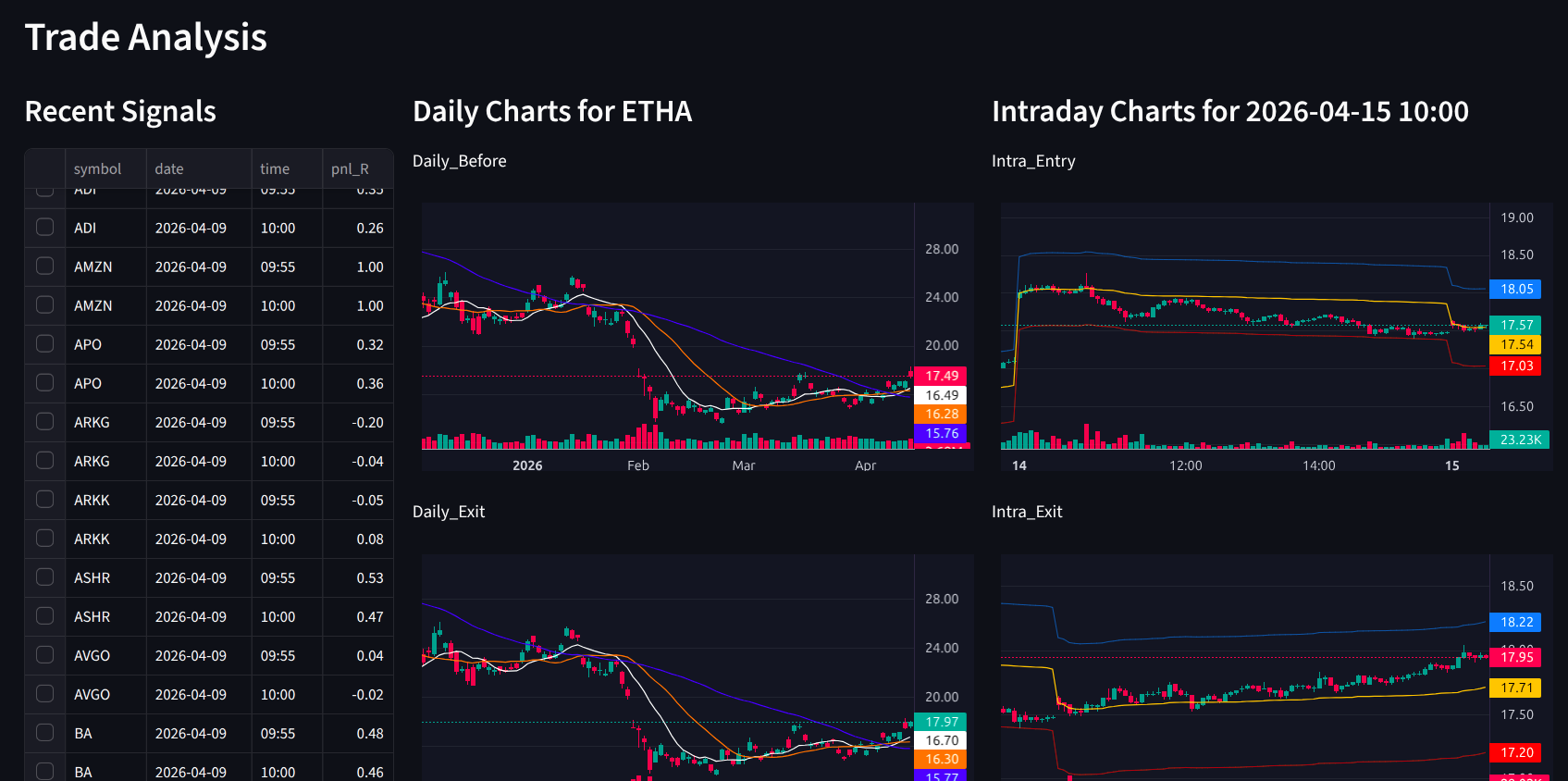 ส่วนสุดท้ายคือการตรวจสอบหน้าเทรดจริง ระบบสามารถดึง Chart ของหุ้นรายตัวจากผลการ Backtest ออกมาแสดงผลได้ ทั้งในระดับ Daily และ Intraday การเห็นกราฟจริงช่วยให้ผมจดจำ Pattern และพฤติกรรมราคาได้แม่นยำขึ้นเมื่อต้องเจอกับหน้าจอเทรด Real-time