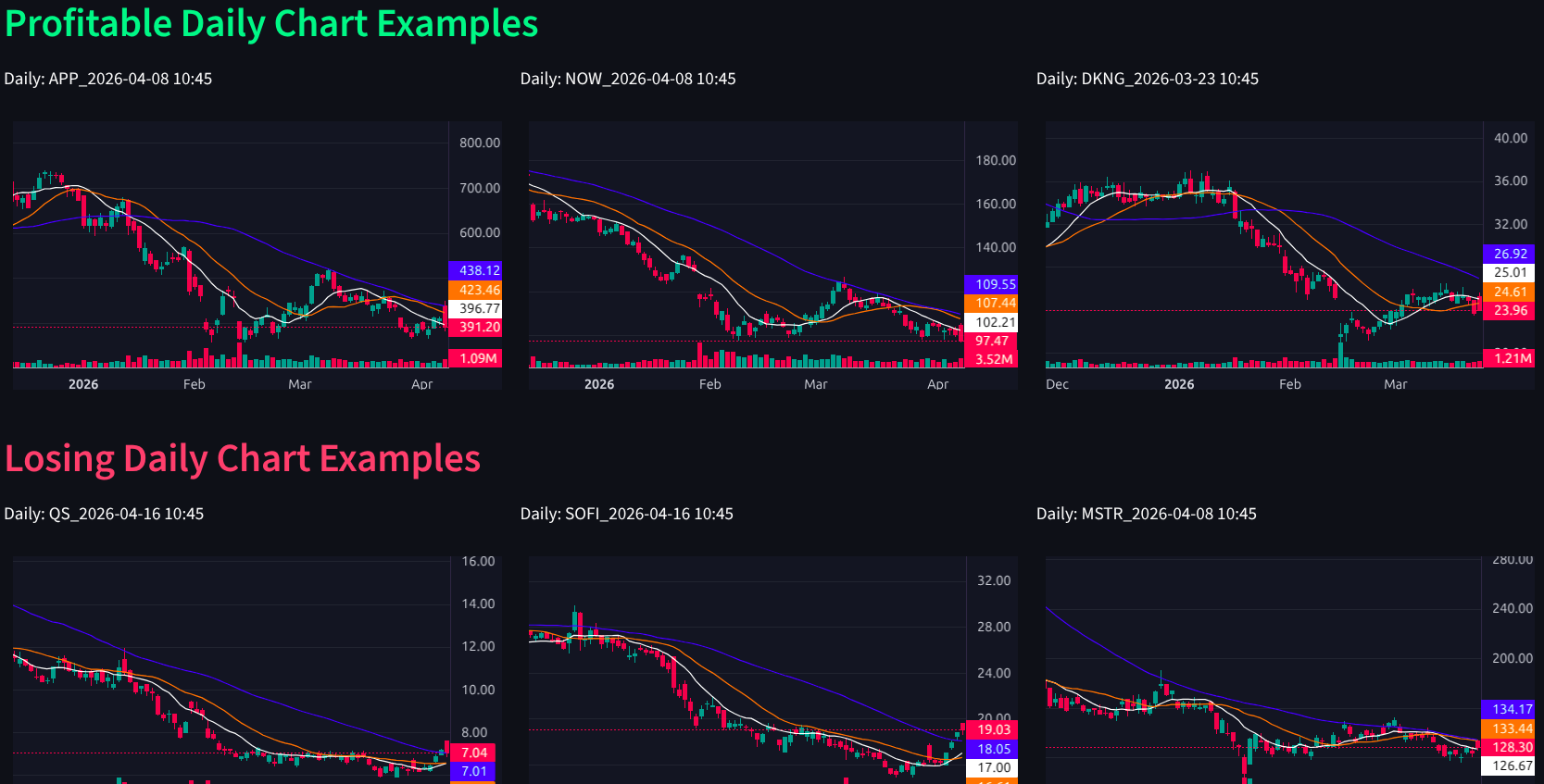 ขั้นตอนสุดท้ายคือการทำ Visual Backtest ผ่าน Chart คัดตัวอย่างการเทรดทั้งชุดที่ได้กำไร (Profitable) และขาดทุน (Losing) มาแสดงผลเปรียบเทียบกัน